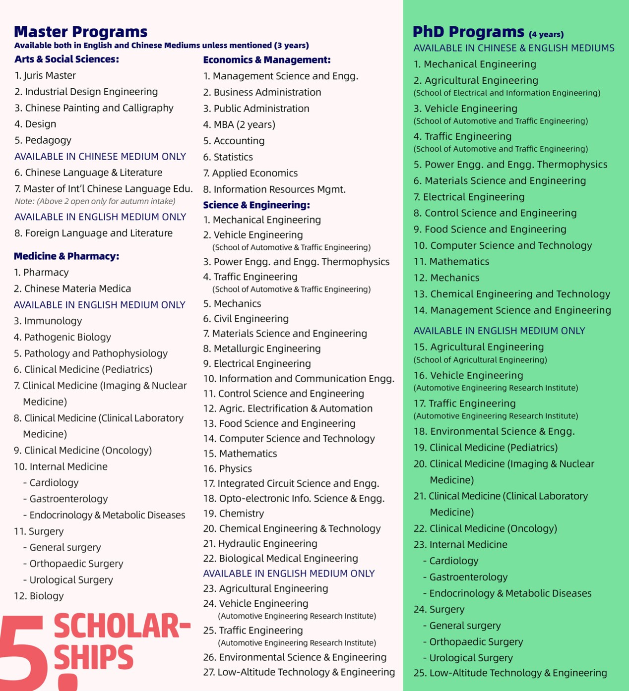 | Major list: | Clinical Medicine, Pharmacy, International Economics and Trade, Civil Engineering, Computer Science and Technology, Business Administration, Accounting, Food Science and Engineering, Chemical Engineering and Technology, Mechanical Manufacturing and Automation, Materials Science and Engineering, Energy and Power Engineering, Vehicle Engineering, Food Quality and Safety, Engineering Management, Visual Communication Design, Information Management and Information Systems, Marketing, Finance |